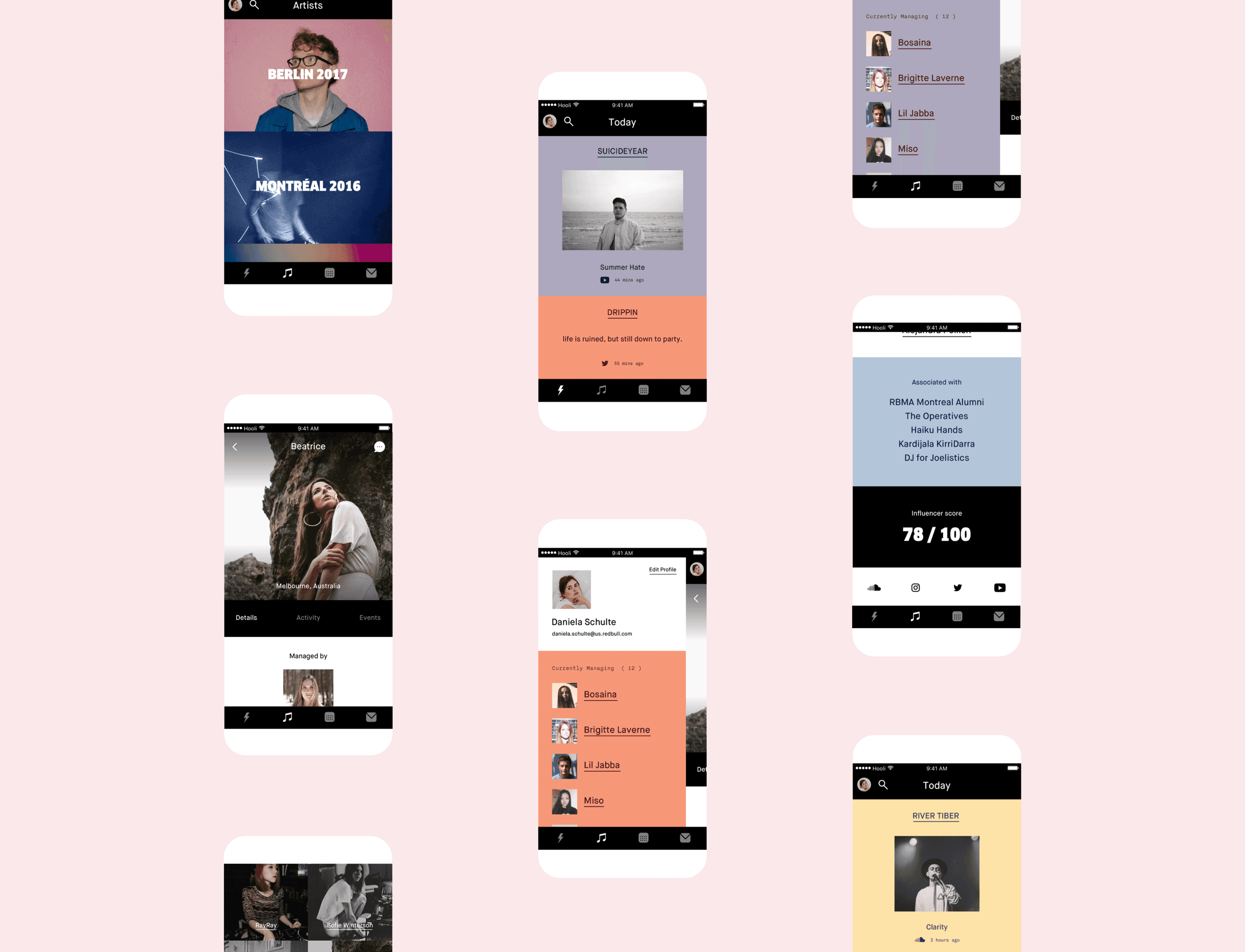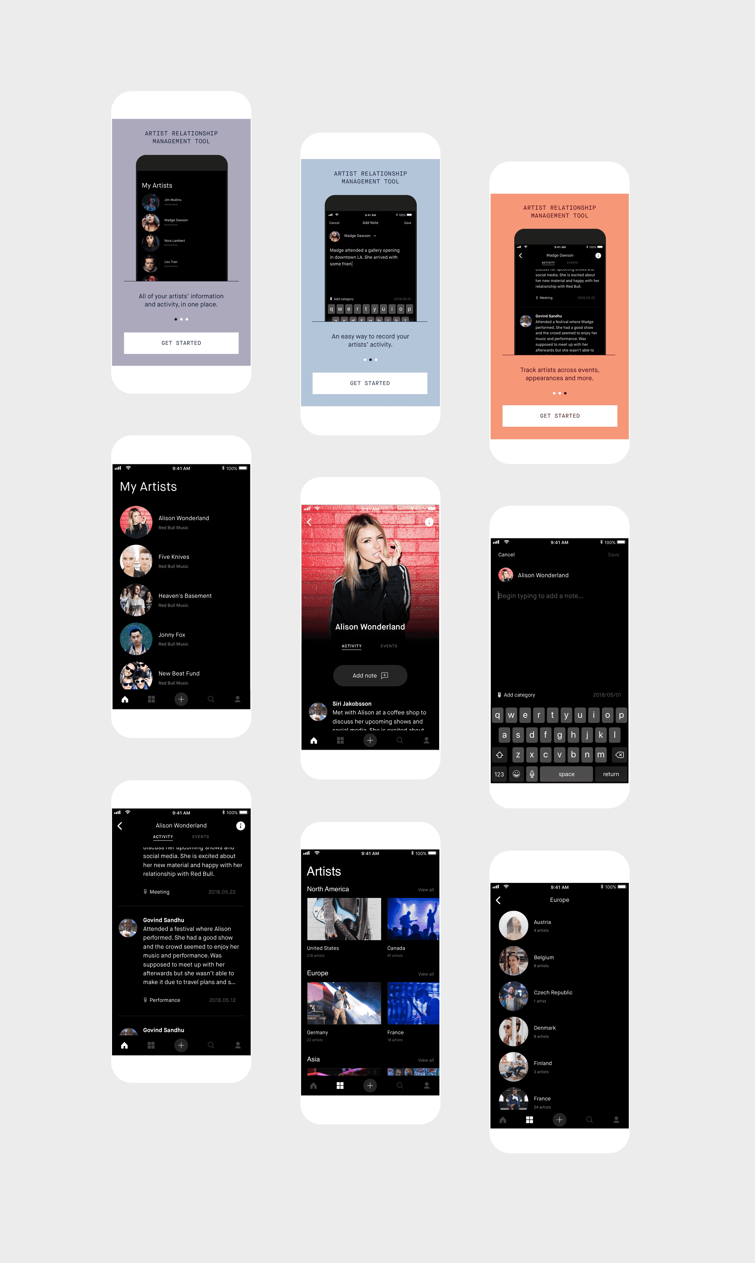 Red Bull Music maintains relationships with hundreds of recording artists across the globe. As these relationships grow, meaningful and noteworthy interactions between the artists and their Red Bull Managers naturally occur. Red Bull Music requested a tool that would enable their Artist Managers to record and track these various interactions. It needed to be on-brand, stylish, and easy to use. The tool also needed to serve as a searchable directory of both artists and managers, complete with contact information and social media accounts.